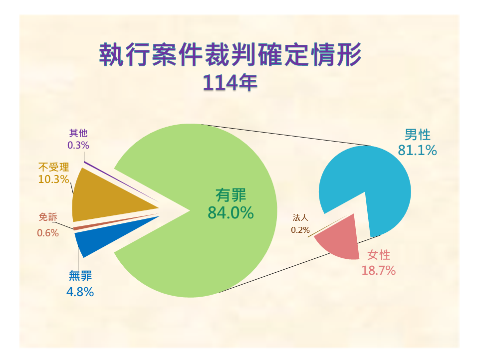 有罪人數中,男性占81.1%,女性占18.7%,法人占0.2%。