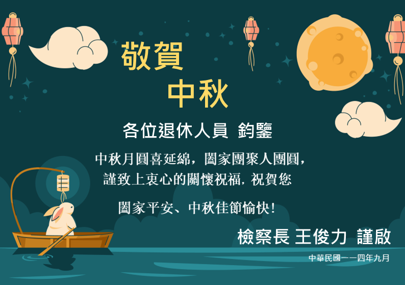 - 114年度中秋節將至,檢附電子賀卡一份,敬祝各位退休人員中秋佳節愉快